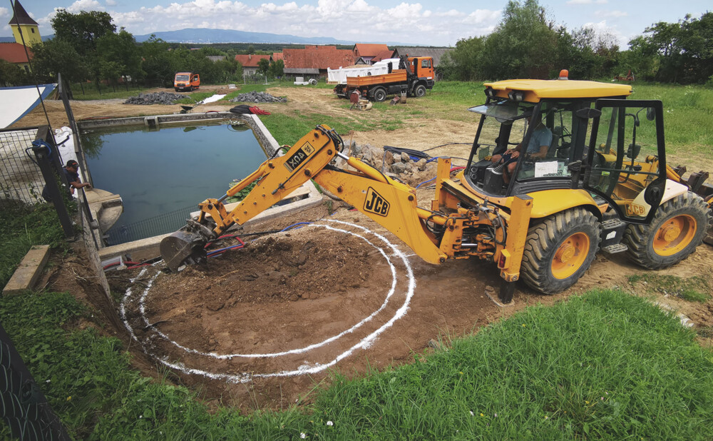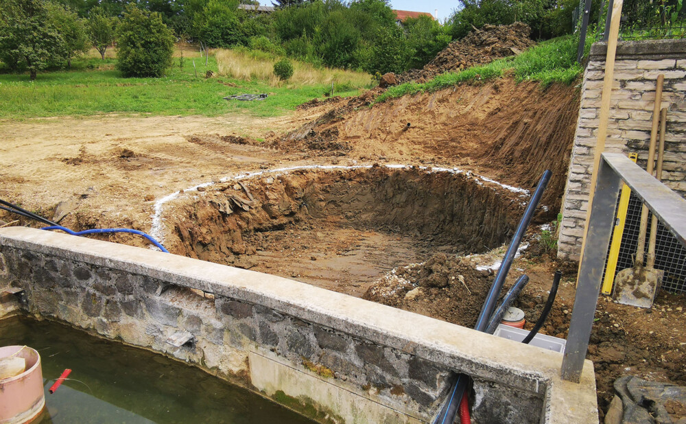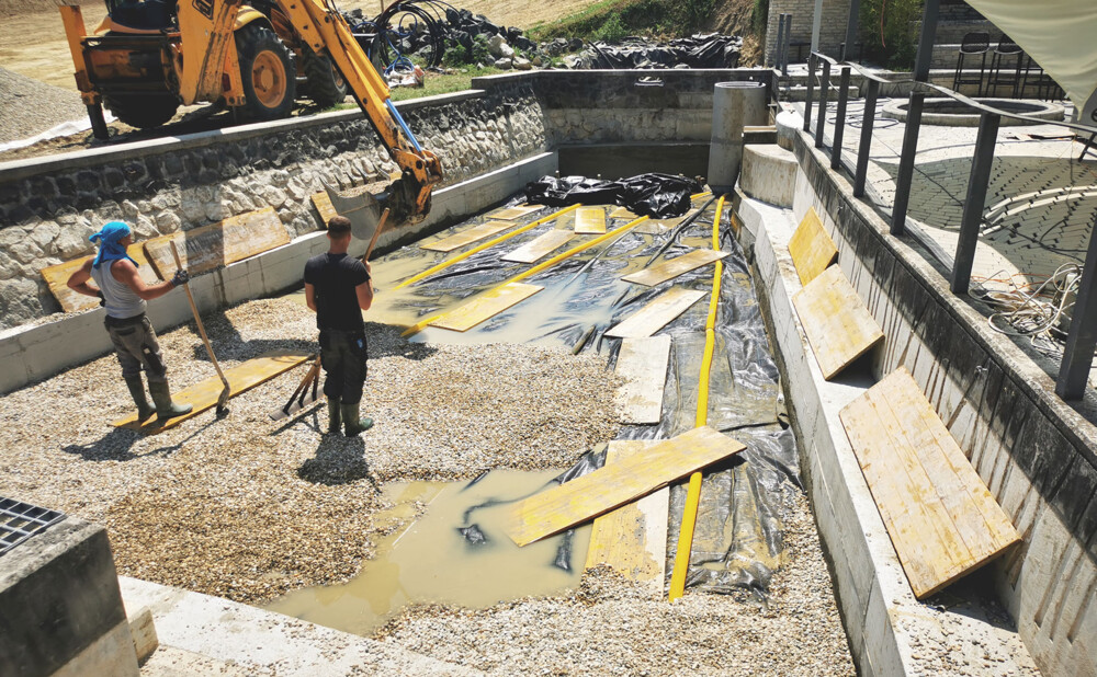 Za početak – pastrve su završile na roštilju. Barem je jedna stvar ispala fino kako treba. Plan je bio produbiti jezero i na dno položiti debeli sloj pranog šljunka, kroz koji prolaze perforirane cijevi. Uz to, odlučio sam izgraditi još jedno, manje biološko filtracijsko jezero (BOG filter), u koje bi se posadile vodene biljke – prirodni filter koji pročišćava vodu iz glavnog jezera. I to je to. Samo je još trebalo izgraditi „veliki akvarij” od 130 m³ vode – s dodatnim biološkim filterom. Ovaj put bez pastrva.