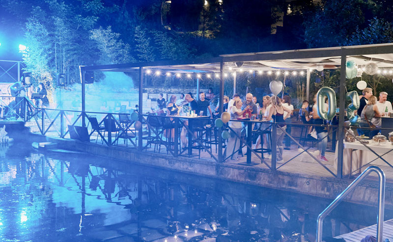 Natkrivena terasa spaja prirodnu ljepotu vodenog krajolika s ugodnom atmosferom za druženje i proslavu. Zahvaljujući pogledu na park i bogato zelenilo, terasa nudi opuštenu eleganciju i šarm. Vlastiti šank i ambijentalna rasvjeta stvaraju savršen ambijent za druženja na otvorenom, rođendane, domjenke i ljetne evente.