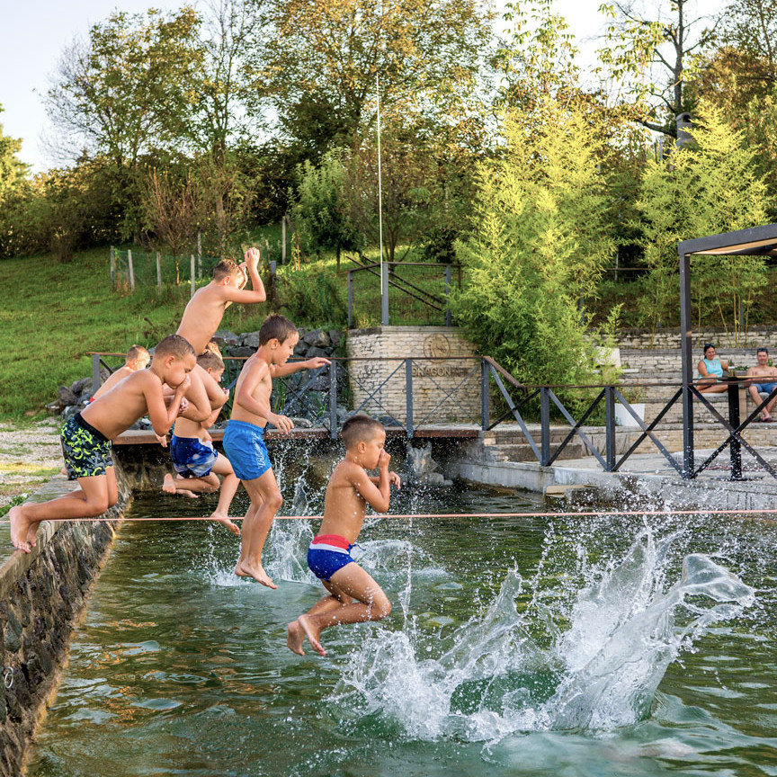 U protočni biološki bazen Jezero, utiče arteški izvor sa prekrasnom, čistom izvorskom vodom. Ovo nije bazen pun klora i raznih kemikalija, ovo je biološki bazen čiju vodu održavamo na prirodan način sa BIO filmom i vodenim biljkama, koje čiste vodu prirodnim procesom kao u rijekama i jezerima. Ako sretnete poneku žabicu, vodenu kornjaču ili vodenu bubu – ne brinite, to ja znak da je voda prirodna. Dubina Jezera je 130 cm. Detaljnije o izgradnji i nastanku jezera pročitajte u našem blogu: Biološko jezero