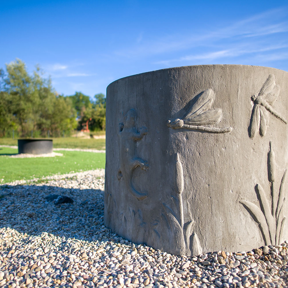 Kroz DRAGONPARK skrivaju se raznovrsni umjetnički radovi. Neki su pažljivo skriveni i teško ih je otkriti odjednom, već pozivaju na istraživanje. Zato je svaki posjet parku novo iskustvo i mala umjetnička potraga. Ovaj kip filozofa, rad kiparice Lare Kraš iz 2022., smireno promatra jezero i simbolizira atmosferu našeg prostora – mjesto gdje se posjetitelji mogu opustiti, usporiti i prepustiti miru koji okolina pruža.