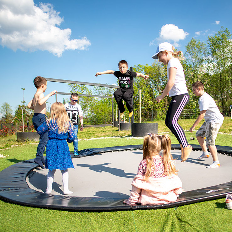 Poleti kao pravi zmaj! Na našem velikom trampolinu skaču i mali i veliki. U parku se nalazi igralište s trampolinom, ljuljačkama i klupama. Hladovinu pravi naš mladi, ali snažni drvored oraha.