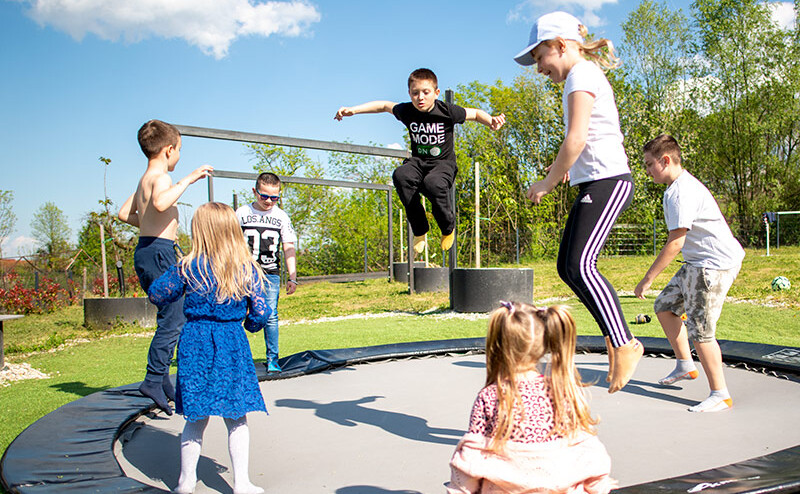 Igralište sadrži veliki, ukopani trampolin kojem ne mogu odoljeti ni djeca ni odrasli. Za bezbrižnu igru, tu su i ljuljačke te klupe za odmor, smještene u ugodnoj hladovini našeg mladog drvoreda oraha.