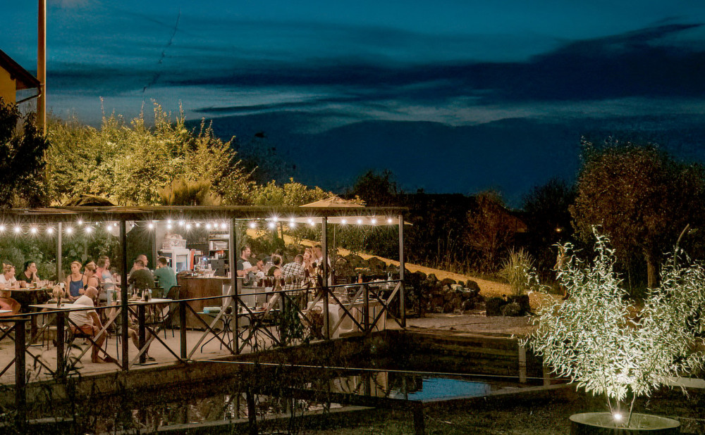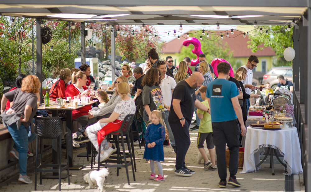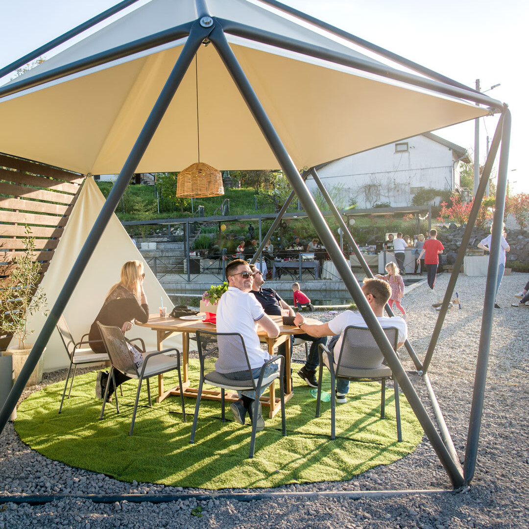 Natkrivena terasa spaja prirodnu ljepotu vodenog krajolika s ugodnom atmosferom za druženje i proslavu. Zahvaljujući pogledu na park i bogato zelenilo, terasa nudi opuštenu eleganciju i šarm. Vlastiti šank i ambijentalna rasvjeta stvaraju savršen ambijent za druženja na otvorenom, rođendane, domjenke i ljetne evente.
