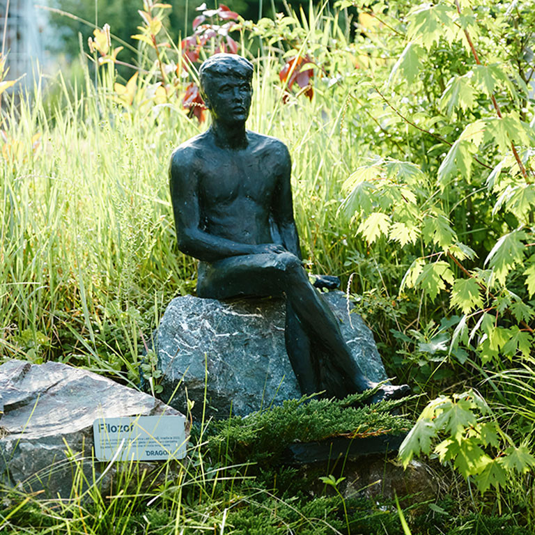 Kroz DRAGONPARK skrivaju se raznovrsni umjetnički radovi. Neki su pažljivo skriveni i teško ih je otkriti odjednom, već pozivaju na istraživanje. Zato je svaki posjet parku novo iskustvo i mala umjetnička potraga. Ovaj kip filozofa, rad kiparice Lare Kraš iz 2022., smireno promatra jezero i simbolizira atmosferu našeg prostora – mjesto gdje se posjetitelji mogu opustiti, usporiti i prepustiti miru koji okolina pruža.